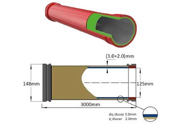 Ürün Özelliği: 1- Çift Cidarlı Boru 2-DN125X3000mm 3- 2+3mm 4- Sertleştirilmiş iç yapı 5-148 mm Flanş 6- 68 HRC 7- 85 BAR 8- 80.000 CBM 9- Fırın Boyalı